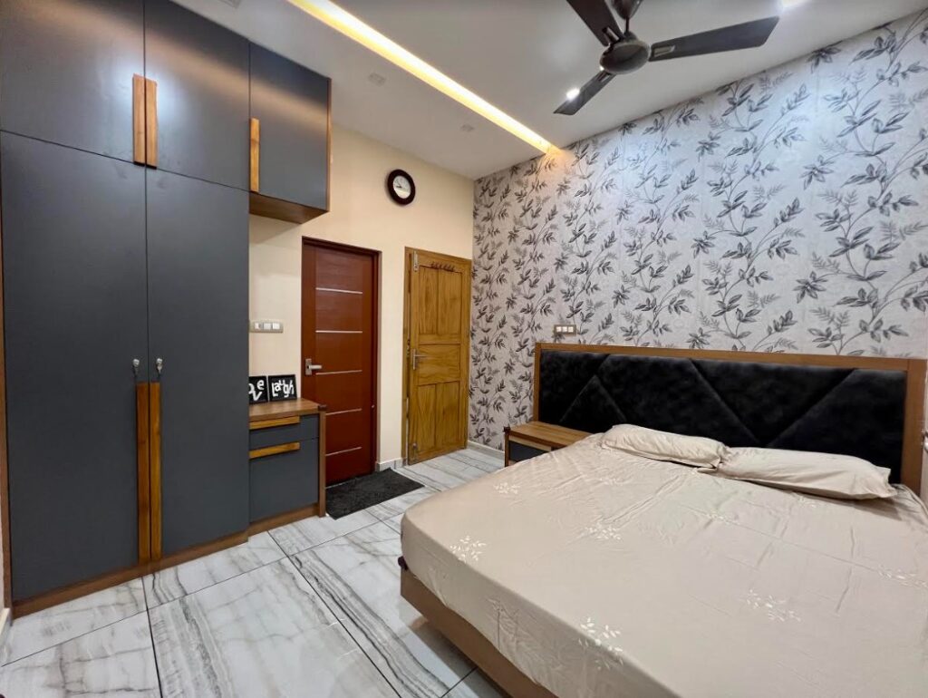 The color palette in modern bedrooms is typically neutral, with shades of white, beige, gray, and black dominating the space. However, bold or contrasting accent colors are often used to add interest and personality to the room. These accents may appear in the form of throw pillows, artwork, or other decorative elements.
